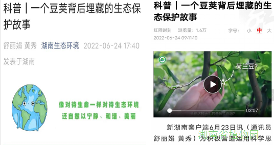 此外,介绍了黄山紫荆在湖南的发现、研究,以及它在石漠化治理中的应用,是生态环境的改善才使它在湖南被发现,因此它还见证了我国生态保护的成效。该视频还被湖南省生态环境厅官方微信公众号、红网时刻转载报道。