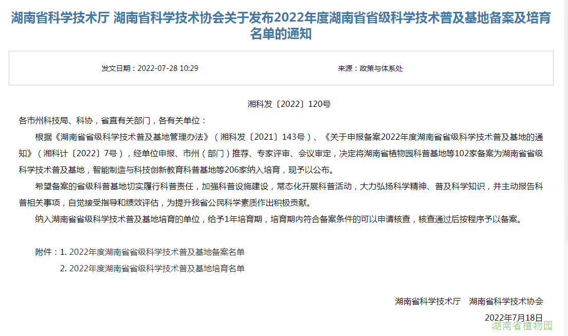 根据《湖南省省级科学技术普及基地管理办法》《关于申报备案2022年度湖南省省级科学技术普及基地的通知》,经单位申报、市州(部门)推荐、专家评审、会议审定,我园备案为湖南省省级科学技术普及基地,被授予“植物多样性湖南省科普基地”牌匾。