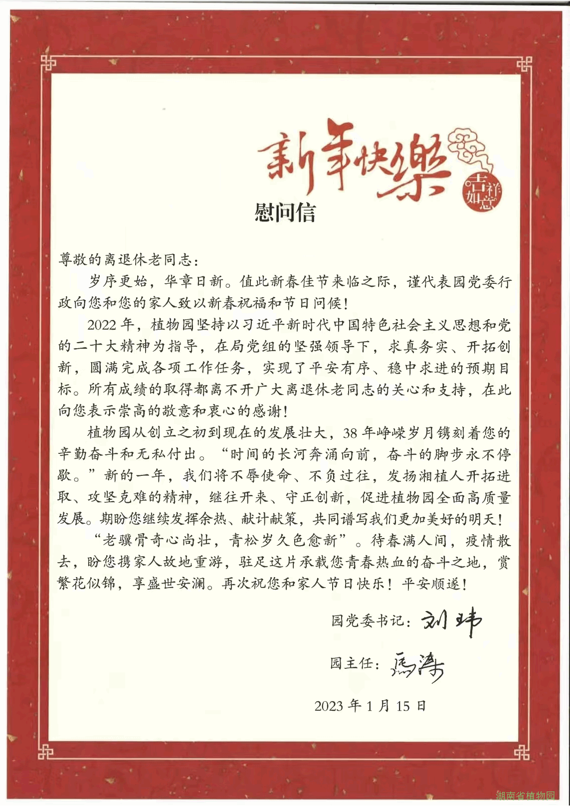 首先,园党委书记刘玮、主任马涛代表单位以慰问信的形式,通过微信工作群及个人微信传达到每位退休职工手中,字里行间,表达了真挚的问候与浓浓的祝福,洋溢着园领导对退休职工无限的感激与关爱。