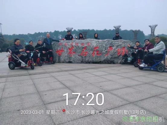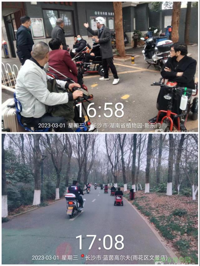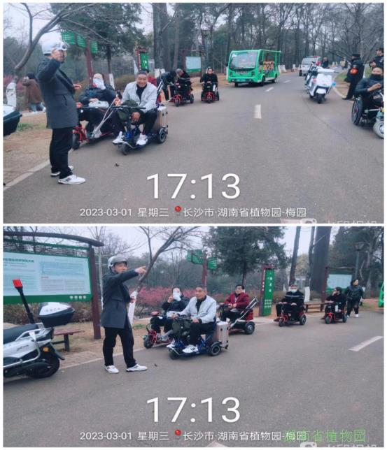 经了解,他们来自江西省萍乡市,是一个由残疾人自发组成的旅游团队,他们上下车行动不便,靠着自驾的电动三轮轮椅车出行,来长沙两天了,在网上看到植物园的美景盛况,都想来感受一下植物园春天的气息,因对长沙地理位置不熟,就跟着导航来到了植物园新东门员工进出通道。