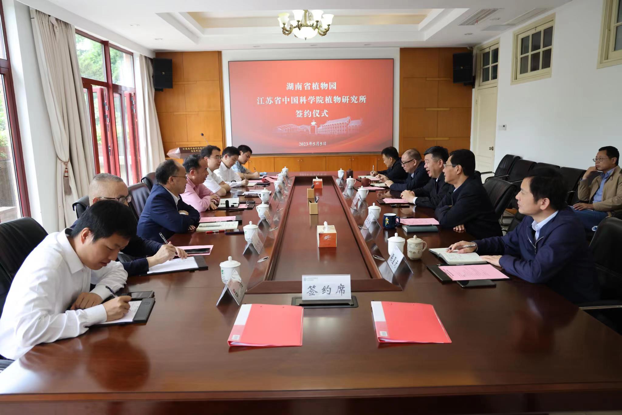5月5日,江苏省中国科学院植物研究所(南京中山植物园)与湖南省植物园战略合作协议签约仪式在南京市举行。江苏省中国科学院植物研究所长姚东瑞,党委书记宇文扬,纪委书记金健,副所长梁呈元、汪仁及相关部门负责人,湖南省植物园党委书记刘玮,主任马涛,副主任李柏海、廖菊阳及相关部门负责人等出席签约仪式。