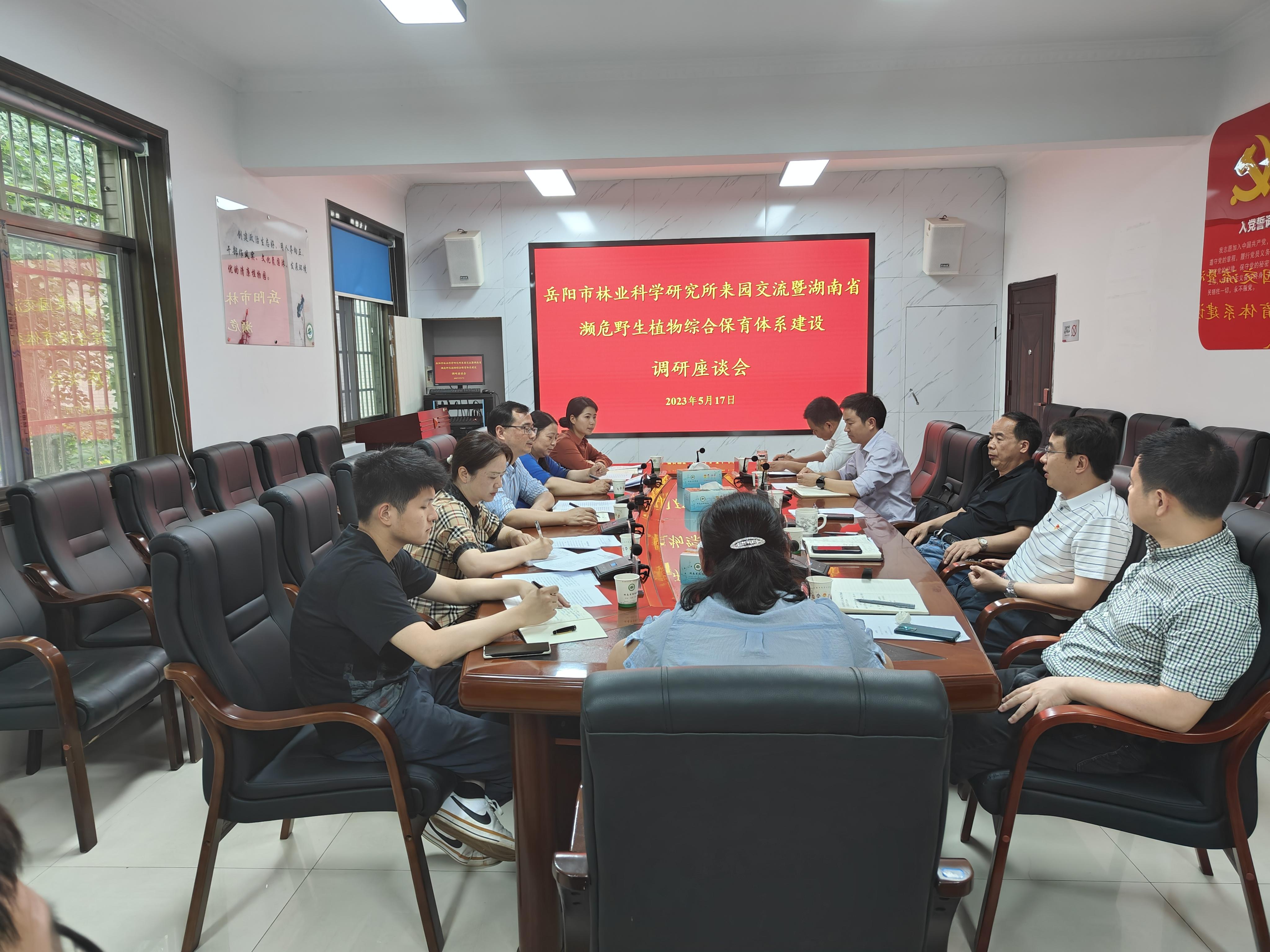 5月17日上午,岳阳市林业科学研究所李科所长一行来我园开展湖南省濒危野生植物综合保育体系建设交流座谈。园党委书记刘玮、园主任马涛、副主任廖菊阳和相关部门负责人及科研人员代表参加会议。