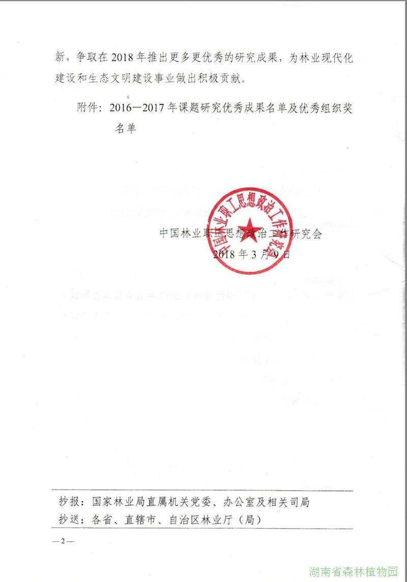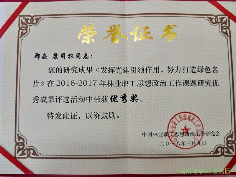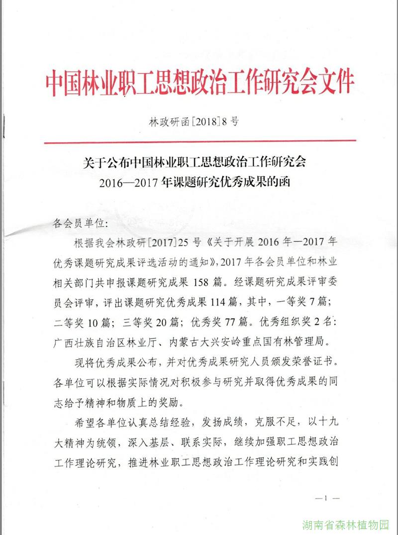 近期,2016-2017年林业职工思想政治工作课题探究优秀成果评选活动结束,我园郑焱、康用权同志的研究成果《发挥党建引领作用,努力打造绿色名片》在评选活动中荣获优秀奖。