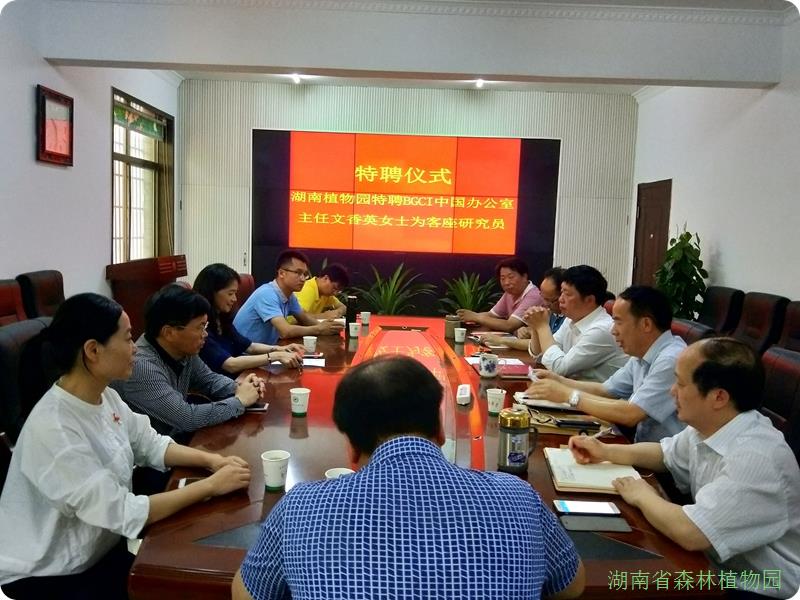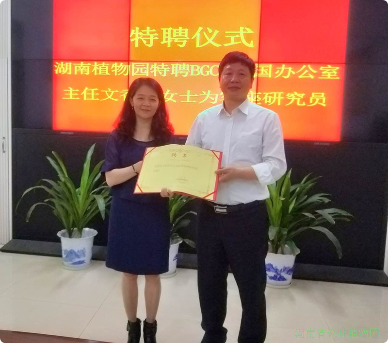 5月6日上午,湖南植物园在行政办公楼会议室举行特聘仪式,BGCI中国办公室主任文香英女士被特聘为我园客座研究员。园党委书记彭春良出席并为文香英女士颁发聘书,仪式由园主任刘玮主持。园副主任李柏海、及党政办、人教处等相关负责人出席仪式。