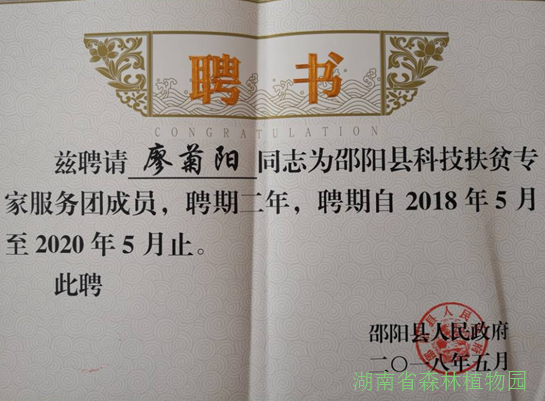 会上,邵阳县县长袁玉华发表讲话,并为邵阳县科技扶贫专家服务团成员颁发聘书。近年来,我园科技人员积极参与全省的科技扶贫、乡村振兴活动,借助我园在城镇生态景观构建技术和花卉种质资源优势,积极为全省的乡村振兴、森林旅游和产业扶贫等领域发展提供材料和技术支撑。