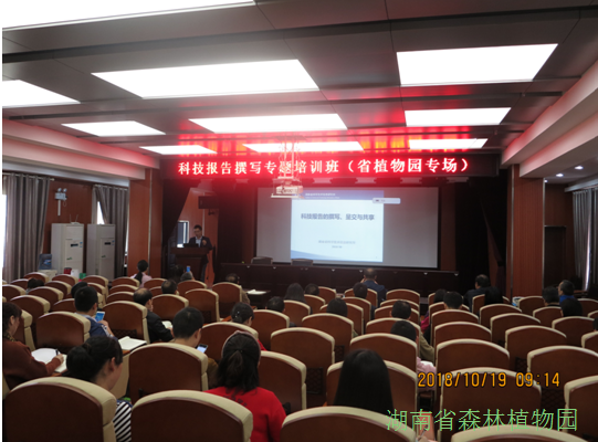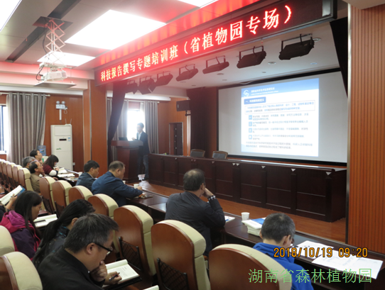 2018年10月份9日上午,科技报告撰写专题培训班(植物园专场)在我园科研中心成功举办。此次科技报告撰写专题培训班由湖南省科学技术厅主办、省科学技术信息研究所承办,我园科管处负责组织此次培训的植物园专场。来自湖南省计量检测研究院、怀化市林科所、天闻数谋科技有限公司及我园的50余名科技人员参加了此次培训,我园副主任郑焱出席。