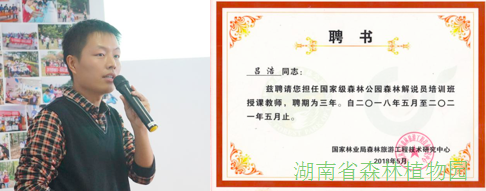 10月12日,由国家林业和草原局国有林场和种苗管理司主办,中南林业科技大学旅游学院承办的2018年国家级森林公园森林解说员培训班(第2期)在华文森林酒店举行开班仪式。国家林业和草原局森林旅游处李奎博士、国家林业和草原局森林旅游处李盼盼、湖南省林业厅国有林与森林公园管理局王建新副局长以及中南林业科技大学旅游学院钟永德院长受邀出席。来自河北、山东等16个地区的56名国家级森林公园管理者和工作人员参加此次培训,我园科普中心6位同事参与了此次培训并获得结业证书。10月16日,培训班结业考试在我园内举行。