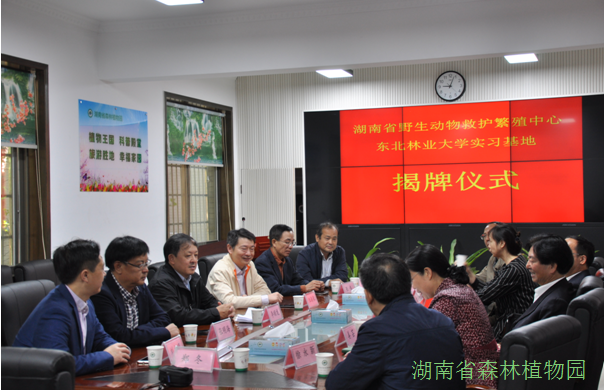 10月27日上午,湖南省野生动物救护繁殖中心与东北林业大学在湖南省森林植物园举行科研教学基地、研究生实践教学基地、大学生就业实习基地揭牌仪式,召开座谈会并实地参观了动保中心动物饲养区及实验室、标本陈列室。