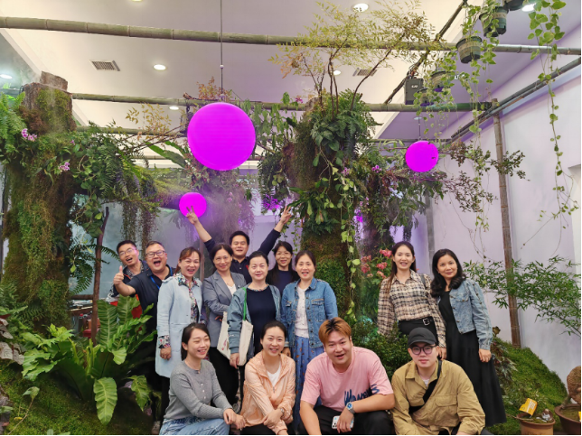 植物园展馆共75平方米,将我园多项科研成果和植物以景观的形式呈现,是产学研用的深度融合。整体景观构建,充分考虑人与自然和谐相处的关系,利用室内的层高,营造立体生态的景观效果,将植物园近年研发的居室园艺造景模式和培育的秋海棠、观赏竹、樱花、杜鹃、苦苣苔、短梗大参、黄常山等植物新品种进行有机组合,结合省花协景观园艺分会的最新的“室内森林”商旅融合体设计理念,将植物的攀援、缠绕、悬挑、垂吊、附生、覆盖、共生等自然特性,以现代造景的手法进行科学融合,打造独具特色的居室园艺商旅融合景观。