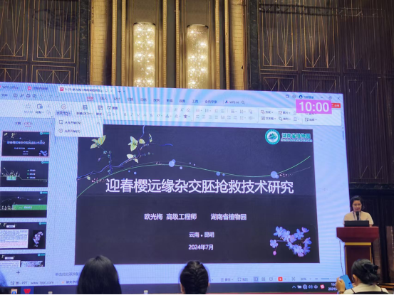 7月18日至21日,2024年中国园艺学会观赏园艺学术研讨会在云南昆明召开,我园资源所樱花科研团队参加会议并在大会上作了题为《迎春樱远缘杂交胚抢救技术研究》的学术报告,阐述了开展的迎春樱远缘杂交果实发育观察、杂交胚抢救以及抢救苗组培快繁技术研究过程和成果,为国内樱花种质资源创制提供了一种新的技术方案。