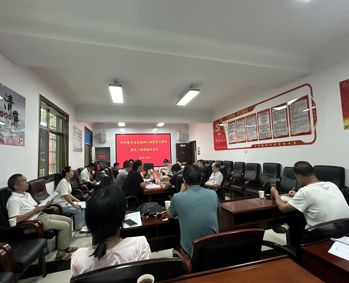 7 月 30 日,科研展览温室植物迁地保育与景观建设工程组织预验收,园副主任胡俊东、党委委员陈迎辉、党委委员谢科、咨询公司现场负责人,纪检监察、财务部、园艺中心、花卉所、保育所、资源所等部门主要负责人及建设、设计、监理单位等20余人参加。