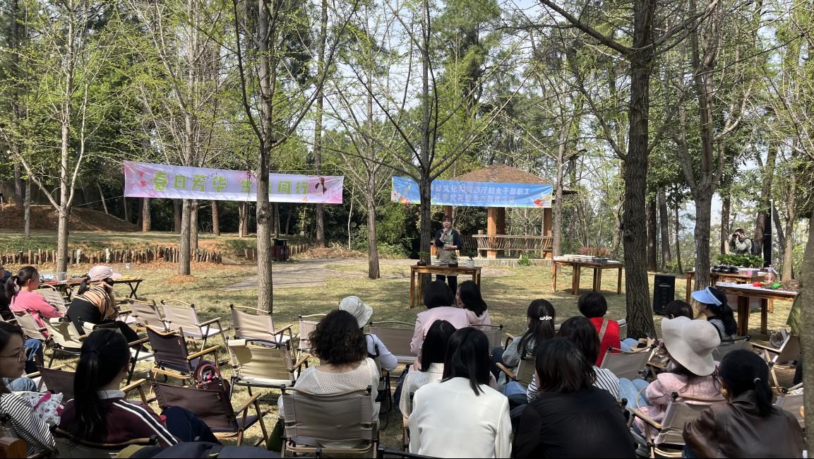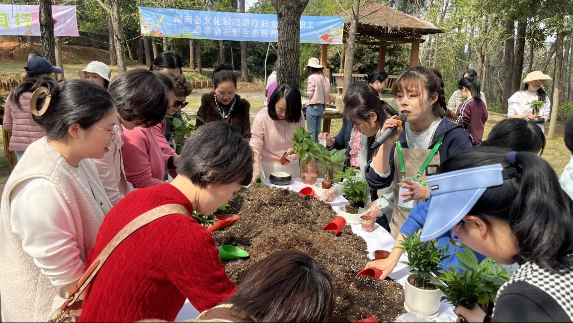 为丰富女职工业余文化生活,倡导绿色生态理念,湖南省文旅厅组织80余名妇女干部职工来我园开展“春日芳华、生态同行”主题活动,通过温室参观、户外赏花、生态景观盆栽种植等一系列生态教育活动体验生态+文化+体验的研学服务新范式活动创新打造“听讲解-看示范-做实践-品茶歇”生态文化课程,由专业园艺师现场教学,通过发财树、千年木等盆栽示范,详细讲解植物搭配技巧与养护知识。