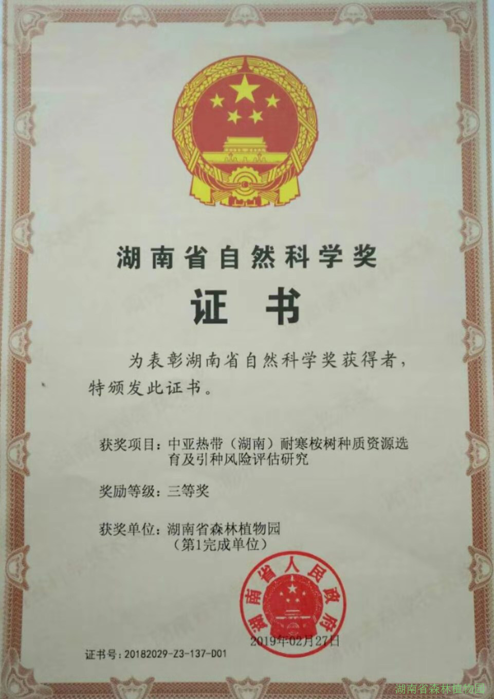 我园副主任李柏海研究员主持完成的研究成果《中亚热带(湖南)耐寒桉树种质资源选育及引种风险评估研究》荣获湖南省自然科学奖三等奖。李柏海研究员与他的研究团队从事耐寒桉树研究近20年,系统地开展了耐寒桉树引种培育的科学研究,在国际国内学术刊物及学术大会上发表了一系列的论文,并鉴定了一系列的研究成果 。该团队分别荣获第十五届湖南省自然科学优秀论文一等奖一篇、第十三届湖南省自然科学优秀论文二等奖一篇。多篇论文荣获中国林学会等国家级学术大会论文奖。该研究团队通过研究发现较冷地区发展桉树的制约因素不仅是冻害问题,还有夏季高温灼害,同时提出了湖南这些有霜降的地区,还需考虑选择合适地形与栽培模式规避冻雨形成的冰雪压折等风险问题。提出了原产地与引种地雨型相互匹配以及其它的相关引种规则。分析阐述了湖南历史上桉树引种失败的原因,提出了耐寒桉树的育种策略,科学地把较冷地区的桉树种类进行了区划,阐述了适宜引种区域与优良种源,指出了不同种类的引种栽培风险与规避措施。提出了桉树引种的组类以及今后开展组内、组间杂交的方向性与成功的可能性。选育出适生栽培树种邓恩桉的优良种源、家系与优良单株。较为系统地研究了邓恩桉无性组培等相关技术。