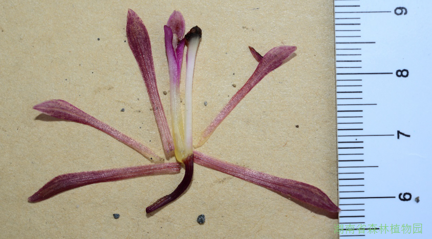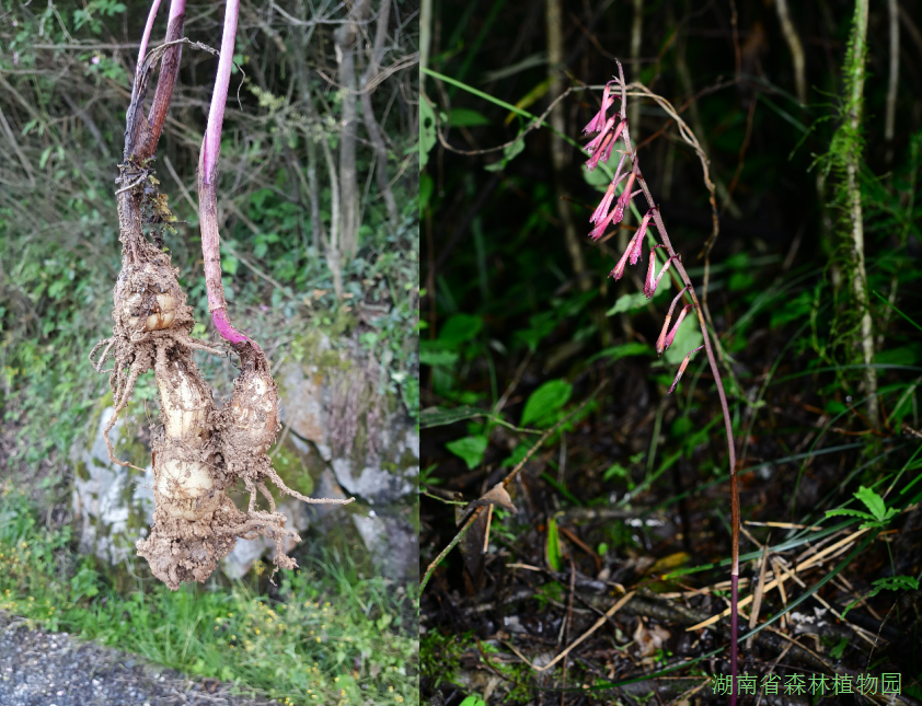 近期,我园湖南本土植物全覆盖项目组在龙山县大安乡采到了一种神奇的兰科植物,这种植物外观呈紫红色,叶片全部退化,是典型的腐生植物。花的结构与杜鹃兰Cremastra appendiculata有许多相似之处,但假鳞茎多个向下延伸,叶片退化仅在基部留下叶鞘而不同。经查阅资料,本种乃是1999年在日本发现的一个兰科新种——无叶杜鹃兰(新拟)Cremastra aphylla Yukawa,为中国新记录植物!这也是杜鹃兰属目前唯一的腐生种。