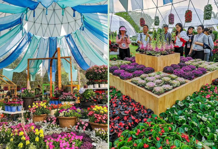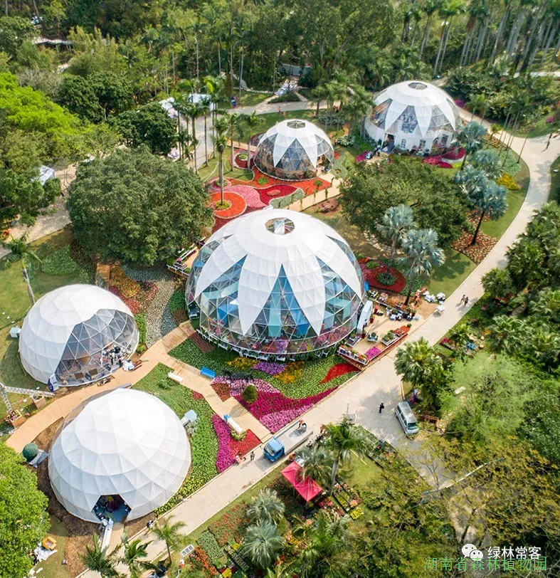 此次我们参观深圳花展时,几个犹如“蒙古包”式的展馆让我们眼前一亮。从下面的鸟瞰图我们可以看到它们可大可小,图案也有所变化,看起来非常轻盈、有现代感。这五个半球形的场馆既美观又实用,被命名为生活馆、艺术馆、花艺馆A、花艺馆B、品种馆,排队参观的人非常多。其他图片是场馆内的布置,十分精致。